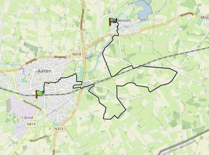 Deze wandeling start vanuit het dorp Aalten en in het dorp loop je eerst regelmatig over diverse leuke paadjes langs de beek Boven Slinge. Hierna wandel je even door het bosgebied “Loohuis” en over een mooi pad langs de sloot “Haartse Waterleiding”. Vervolgens wandel je via enkele verharde wegen naar het buurtschap Haart. Onderweg naar het stadje Bredevoort wandel je eerst over een iets langer stuk verharde weg om daarna via mooie onverharde paden en zandwegen uit te komen bij de stad. In de stad loop je nog even door enkele verrassende steegjes en straten. Een leuke afwisselende wandeling.
