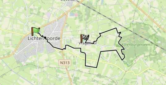 Deze wandeling start vanuit het dorp Lichtenvoorde en je loopt eerst enige tijd door het dorp. Hierna wandel je over een leuk pad rondom een waterplas. Via rustige zandwegen en enkele stukjes asfalt kom je uit bij het natuurgebied “Korenburgenveen”. Je loopt hier geruime tijd door het bos en passeert een “uitkijktoren”. Vervolgens ga je via leuke paadjes en een langere zandweg naar het dorp Vragender. Al met al een leuke afwisselende wandeling.