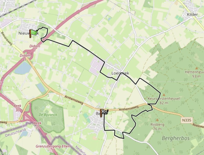 Je start deze wandeling vanuit het dorp Nieuw-Dijk en je loopt al snel een rondje door het “Meikamerbos”. Via diverse rustige landwegen loop je naar het dorp Loerbeek. Hierna kom je uit bij het mooie bosgebied “Bergherbos” en begin je direct met de beklimming van de “Keurvorstenheuvel” (hoogte 82 m). Hierna wandel je langere tijd over mooie en heuvelachtige bospaadjes. Je passeert hierbij nog een zandvlakte met een mooi uitzicht op het dorp Beek. Je komt even later aan bij het dorp Beek.